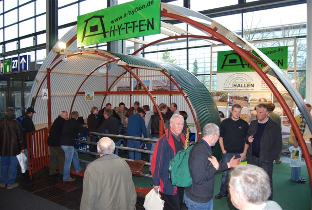 Mit heutigen technischen Mitteln sprich: Internet-Präsenzen, lassen sich Produkte jeglicher Art aber auch auf einfache, individuelle und schnelle Weise näherbringen. Außerdem haben wir alleine bundesweit bisher ein paar Tausend Rundbogenhallen ausgeliefert, auf die Interessenten häufig verweisen. "Beim ,Nachbarn, gesehen" ist oft die beste Werbung für uns. Trotzdem werden wir versuchen, weiterhin auf Landwirtschafts-Messen auszustellen. Der direkte Kontakt und Feedback von sehr vielen Kunden auf einer Messe an wenigen Tagen ist uns nach wie vor viel wert. Diese beiden Fotos zeigen Messen in Rendsburg und Hannover, jeweils mit angedeuteten 5 m und 8 m breiten Hallen.